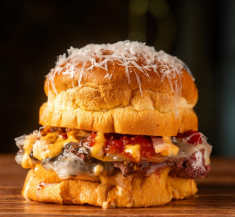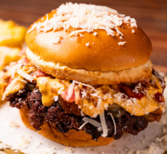 Pan Brioche, doble pattys smash de 180 Gr, doble cheddar, bacon, pulled pork, cebolla krunch, mayonesa bacon y parmesano rallado.
